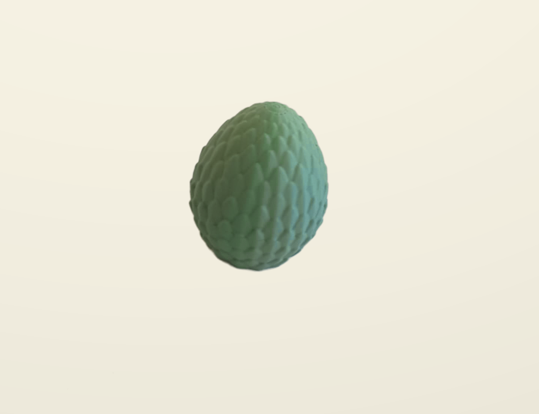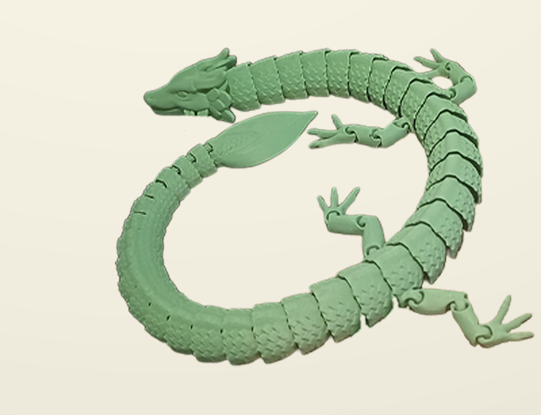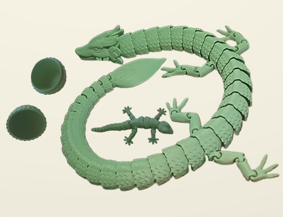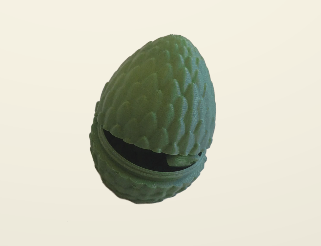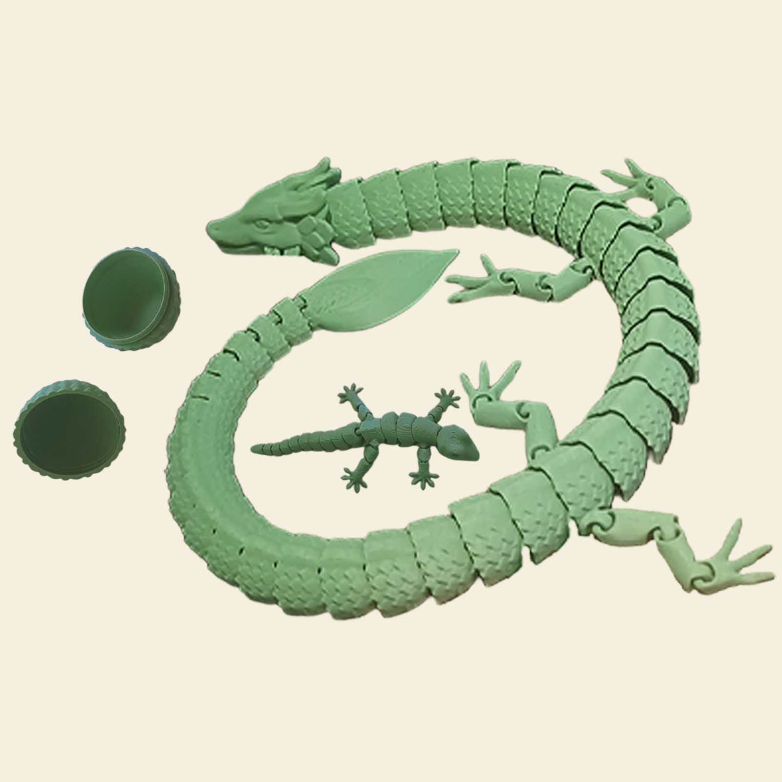 Dragon articulat realizat prin imprimare 3D, cu structură segmentată ce permite mișcare fluidă și poziționare variabilă. Setul include un dragon de dimensiune mare și un ou de dragon infiletabil, în interiorul căruia se află un pui de dragon. Obiect tridimensional destinat explorării vizuale și tactile.
