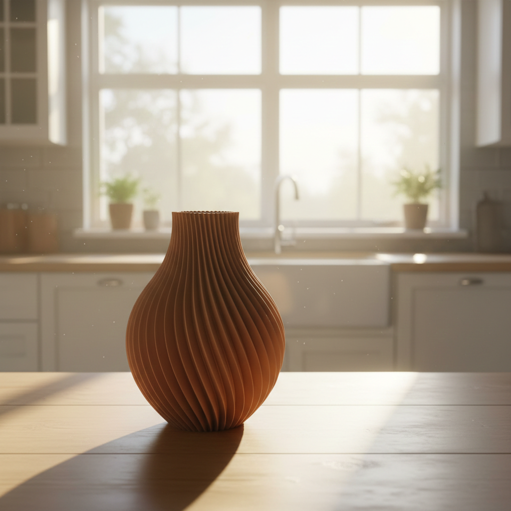 Nuanța caldă de maro-bej, cu ton de teracotă, apropie obiectul de materialele naturale și îl face compatibil cu interioare scandinave și contemporane. Finisajul mat temperează suprafața și reduce caracterul tehnic al imprimării 3D, oferind vazei un aspect apropiat de ceramică.