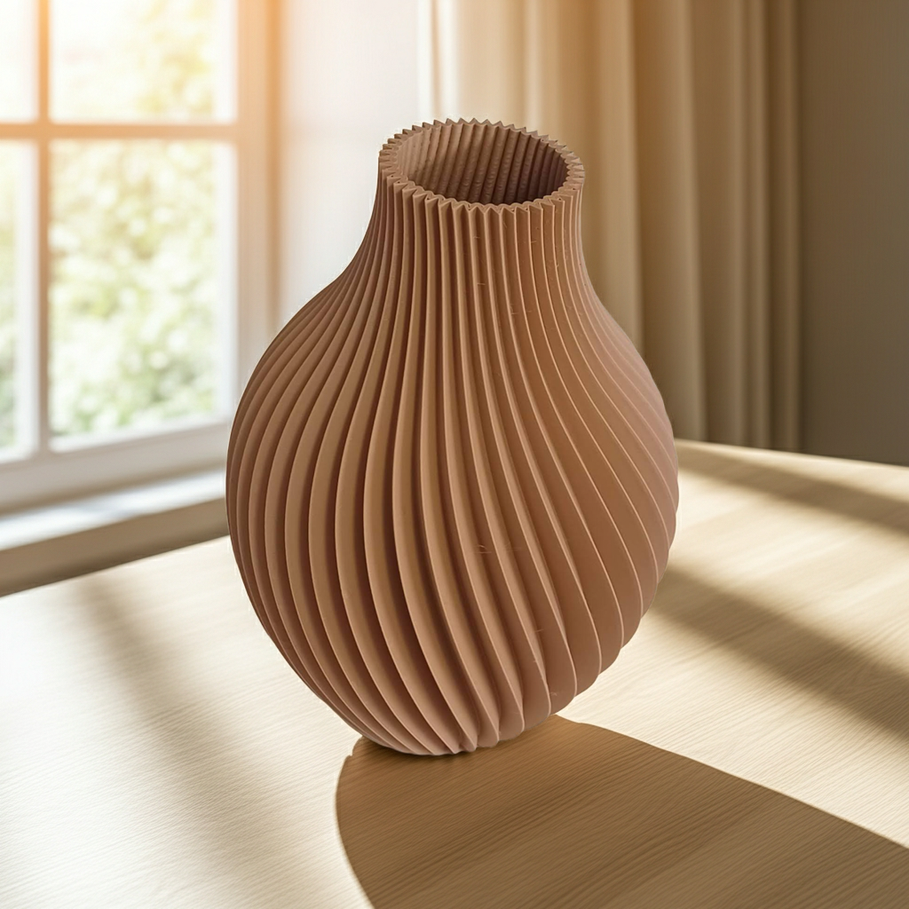 Vază decorativă cu suprafață elicoidală și formă echilibrată, realizată prin imprimare 3D. Nuanța caldă de teracotă și textura mată o fac ușor de integrat în interioare scandinave și contemporane. Funcționează atât ca piesă singulară, cât și în ansamblu cu flori decorative.