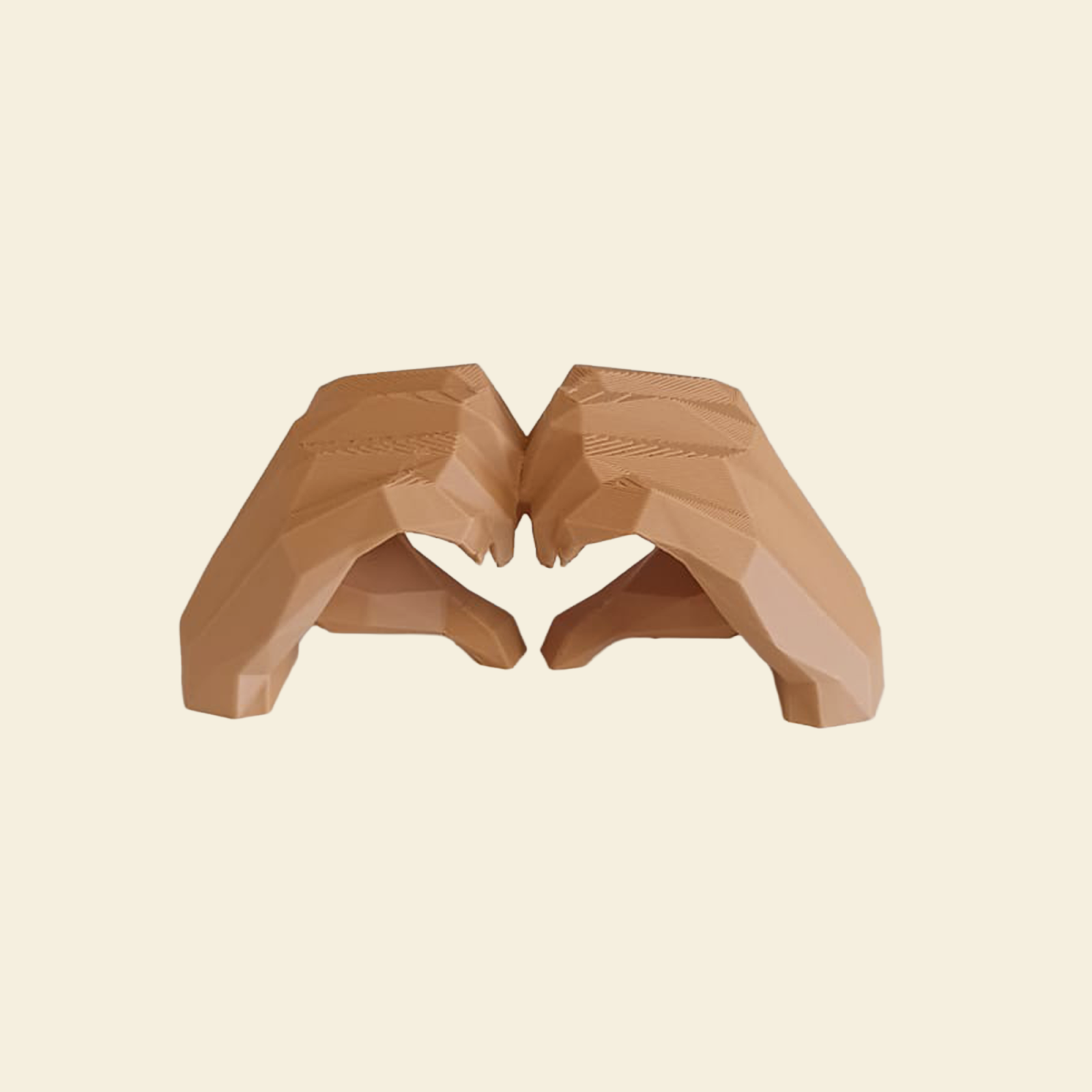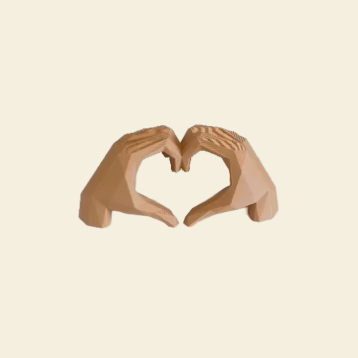 Decor tridimensional reprezentând două mâini stilizate care formează o inimă, realizat prin imprimare 3D.
